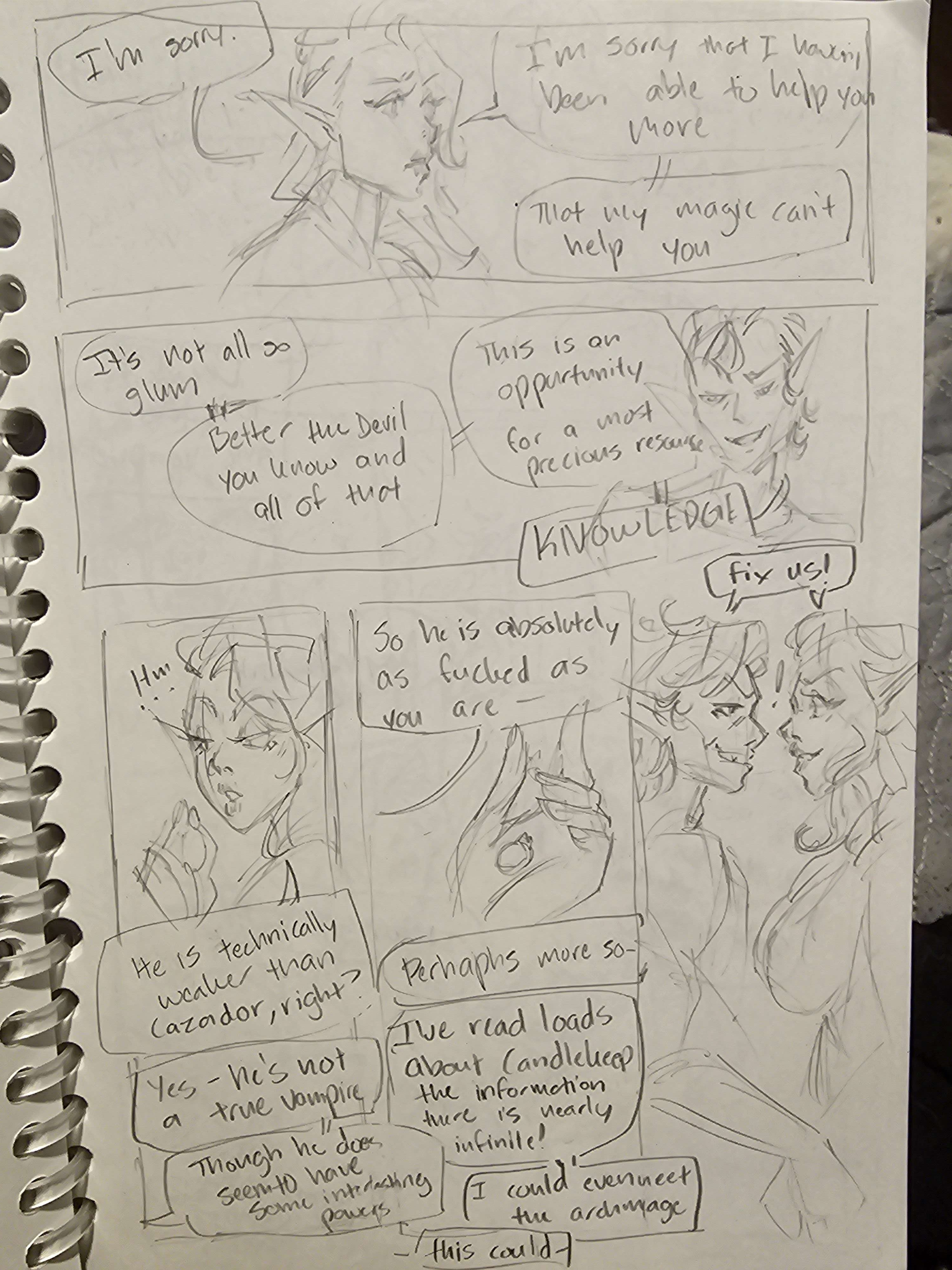 Part of the problem is that thumbnails can be done on the go but lined pages have to be done on the big screen in clip studio. I'm also terrible at lettering, but I'm getting better by including dialogue in thumbnails. I have messy handwriting, but I think that writing dialogue into the thumbs actually makes it easier to see if it works naturally. Lots of dialogue actually gets re-worked when I go and actually do pages which can tilt entire page compositions!